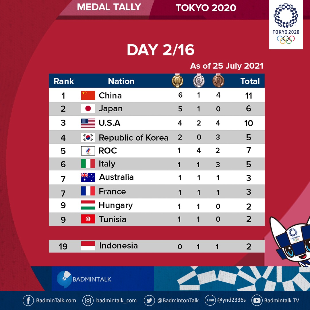 Badminton Talk On Twitter Tokyo2020 Medal Tally Day 2 Sunday 25 Jul 2021 Chn Added 3 More Gold Medals Today From Diving And Weightlifting Indonesia Ends The Day In Top 20